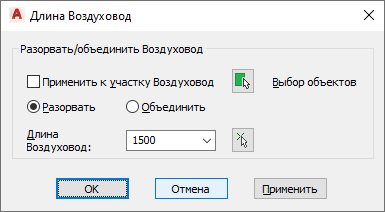 | Создать разрыв на сегменте | Выберите "Разорвать" и введите значение в поле "Длина воздуховода". Кроме того, можно нажать |