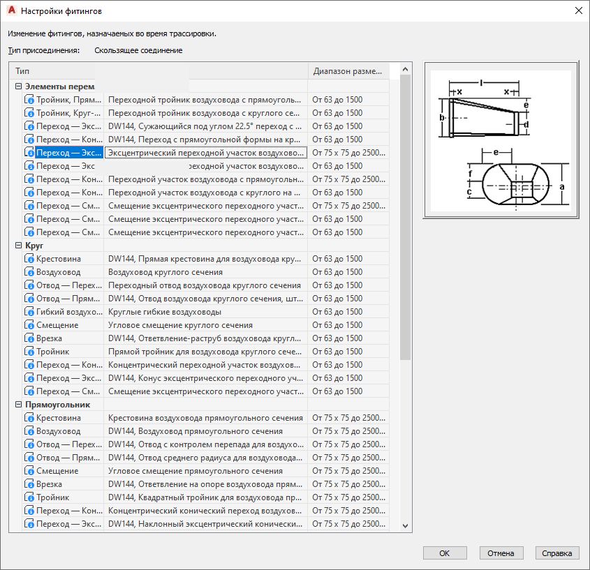 В таблице "Параметры фитингов" отображается текущий тип соединения, а также список доступных типов и элементов.