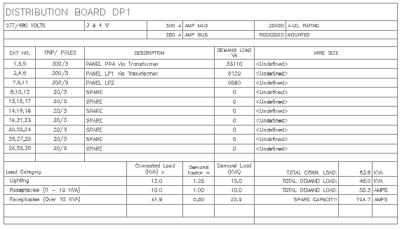 Как правило, спецификация панели добавляется на лист спецификаций, не содержащий панелей. Но в проекте небольшого масштаба спецификация панели может быть добавлена в чертеж, содержащий одну или несколько панелей. Имеется возможность адаптировать спецификацию, чтобы она содержала данные по панелям, цепям, проводам и нагрузке, которые в ней содержатся, и чтобы изменить ее организацию.