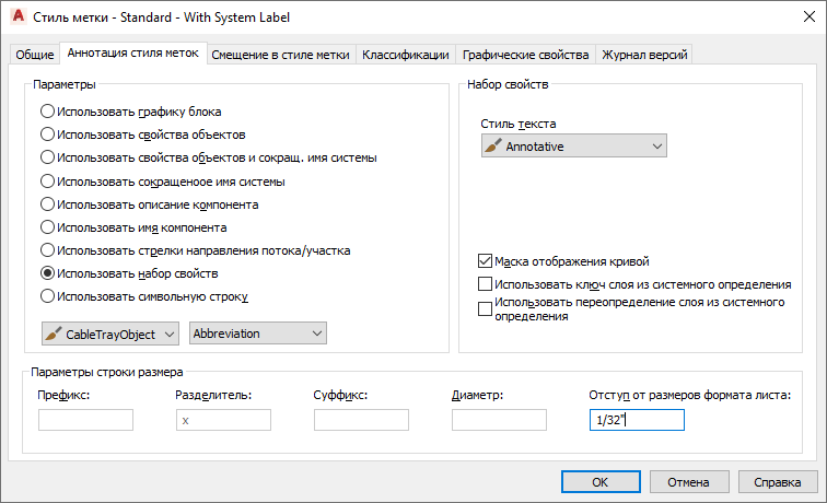 В Architecture метки являются аннотативными объектами, если соответствующий стиль меток кривых сконфигурирован как аннотативный. Стиль меток кривых можно сконфигурировать двумя способами в зависимости от выбранного типа стиля.