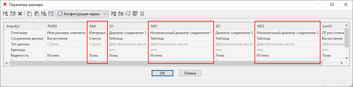 Диалоговое окно "Параметры размера" обновлено для отображения дополнительных отдельных размеров внешнего (номинального) диаметра (ND1, ND2) и материала (Mat), как показано далее. В предыдущих версиях в конструкторе содержимого был доступен только фактический диаметр (D1, D2).
