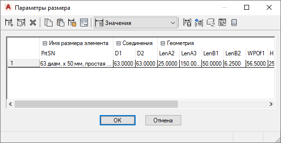 - Значения. Данный режим служит для просмотра и изменения значений параметров, если они хранятся как списки, таблицы и константы. Несколько размеров элементов задаются путем ввода нескольких значений для параметров размеров. Можно вводить значения вручную или копировать и вставлять их из другого элемента, открытого в Конструкторе содержимого, из элемента, открытого в Редакторе каталогов, или из электронной таблицы. Для параметров соединителей также можно вставить соответствующие размеры для сегментов, используемых по умолчанию во время компоновки.