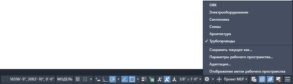 Для активизации рабочего пространства выберите имя рабочего пространства из раскрывающегося списка в строке состояния приложения.