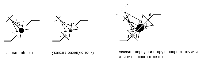 Можно изменять размеры условного обозначения согласно опорным точкам. Когда размеры изменяются согласно опорным точкам, определяется текущая длина обозначения в качестве ссылки для задания новой длины. Например, если одна сторона условного обозначения равна 2,5 единицы длины и необходимо расширить его до 3,5 единиц, используйте 2,5 в качестве ссылочной длины и 3,5 в качестве новой длины. Также можно проводить масштабирование путем задания базовой точки и двух опорных точек и перетаскивания обозначения.