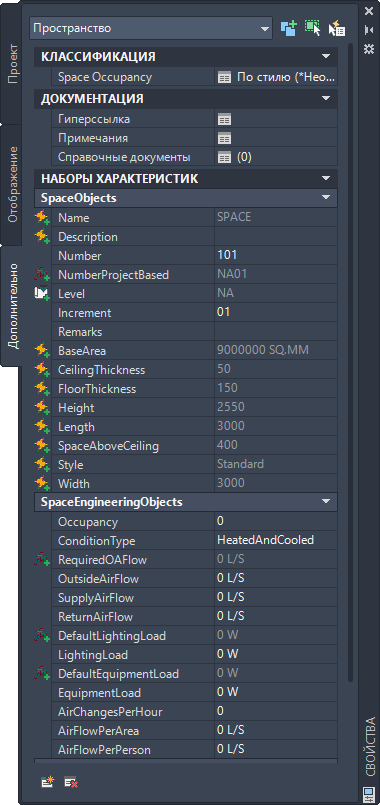 | LightingLoad | Величина осветительной нагрузки для помещении. Если в стиле пространства указано значение осветительной нагрузки на единицу площади, то набор DefaultLightingLoad рассчитывает данное значение на основе площади пространства. Это значение можно переопределить: для этого нужно просто ввести новое значение в поле LightingLoad. |