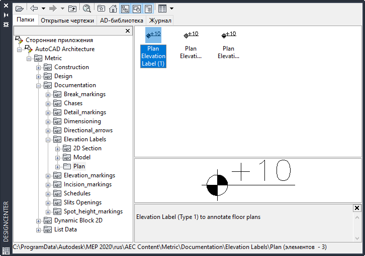 AD-библиотека (библиотека для архитектурного проектирования, конструирования и сооружения зданий) состоит из чертежей, обозначений, стилей объектов и стандартных схем аннотирования, добавляемых пользователем к чертежам в процессе разработки проекта и создания документации к нему. Имеется возможность создания инструмента на инструментальной палитре с использованием стандартных компонентов AD-библиотеки, доступных в Центре управления. В Центре управления можно также создавать инструменты из блоков, но параметры таких инструментов слегка отличаются.