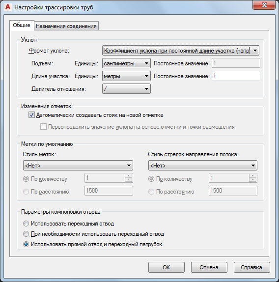 - Настройки уклонаНа вкладке "Общие" диалогового окна "Настройки трассировки труб" выберите формат уклона.