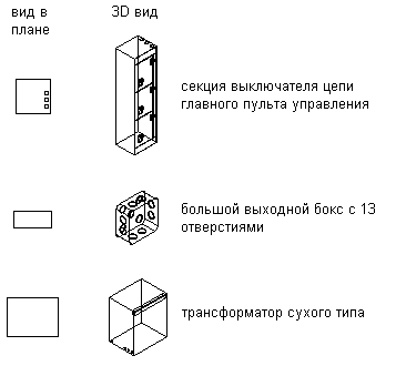 Как правило, добавление устройств в вид в плане выполняется в процессе создания конструкторской документации. Вместе с тем имеется возможность отображать элементы по-другому и в других видах. Например, в 3D виде электрической системы можно отобразить реальную геометрию устройств, а в двухмерном виде в плане их можно показать с помощью упрощенных обозначений.