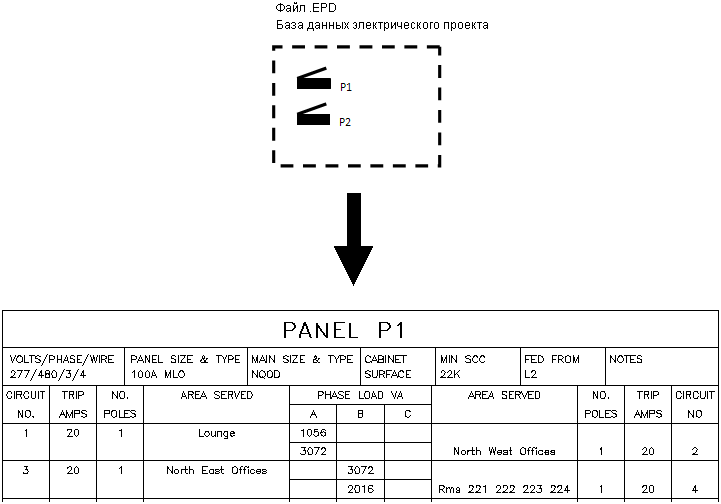 Предназначенные для конструкторской документации спецификации панели создаются на основе базы данных электрического проекта. Данные о цепи берутся непосредственно из базы данных электрического проекта.