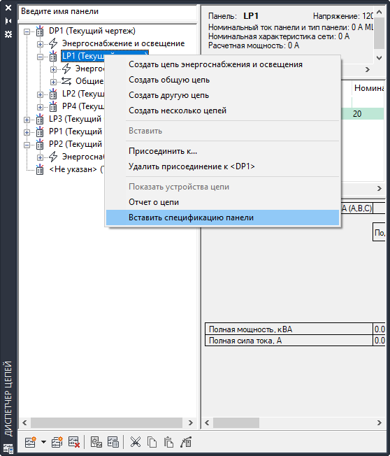 Создание спецификации панели в текущем чертеже с помощью Диспетчера цепей.