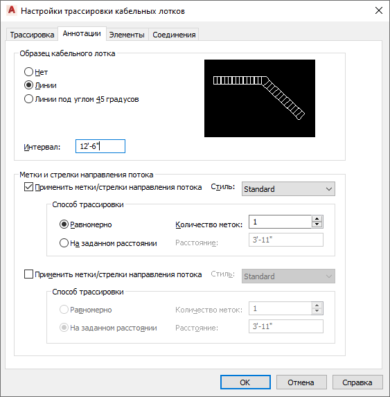 Можно задать метки или стрелки направления движения потока, которые будут добавлены к участкам кабельного лотка во время его построения. Можно также указать применяемый образец штриховки. Можно задать штриховку вертикальными линиями или с наклоном в 45 градусов, а также указать интервал между линиями.