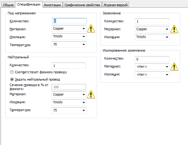 4. В группе "Нейтральный" задайте значения свойств для нейтральных проводов: