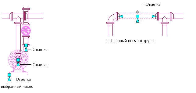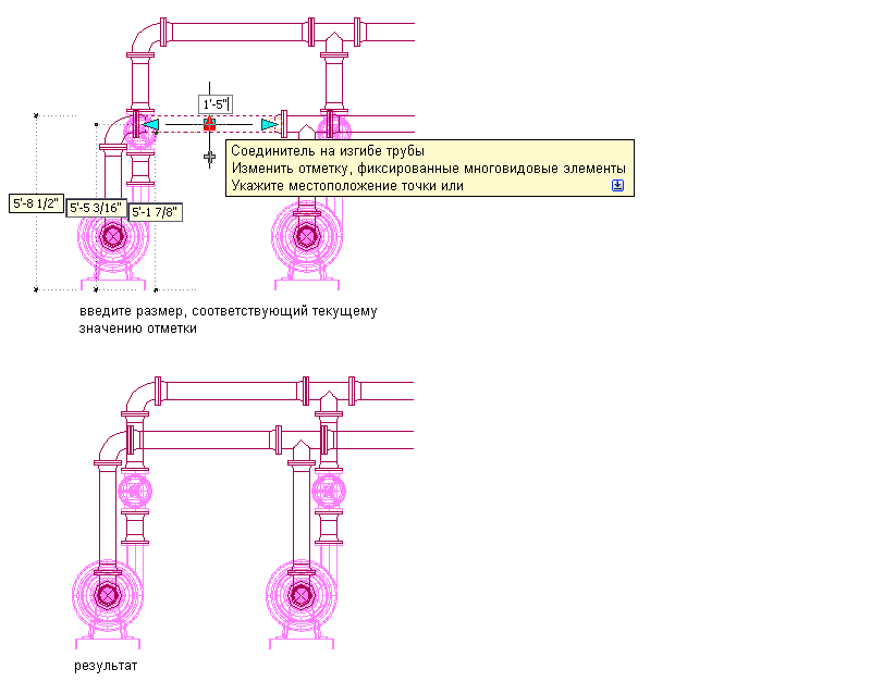 ) позволяют на виде модели изменять отметку элементов и сегментов трубы относительно верха, осевой линии или низа сегмента.