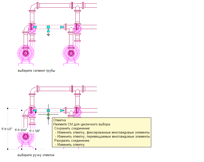 Если к элементу или сегменту трубы присоединены другие объекты, можно указать, требуется ли при изменении отметки объекта-трубы сохранять эти соединения.