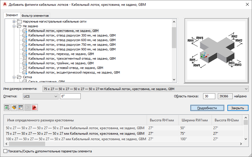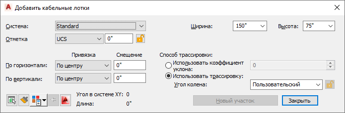 Диалоговые окна кабельных лотков и фитингов кабельных лотков