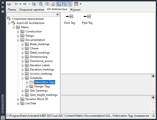 Прим.: Обозначениями для проектирования в Центре управления служат мультивидовые блоки AutoCAD®. Эти обозначения не связаны с объектами инструментарий AutoCAD MEP 2027. Они предназначены только для аннотирования чертежей.