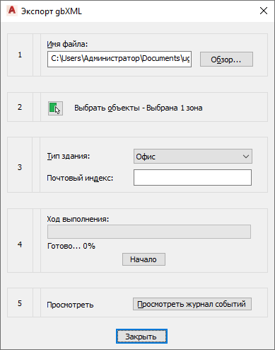 "Ход выполнения": нажмите кнопку "Начало", чтобы запустить процесс экспорта данных.