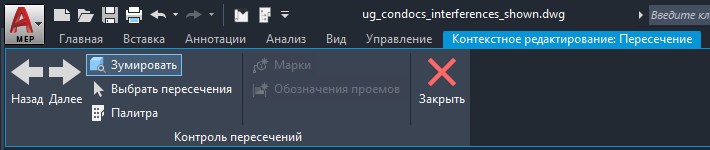 | скрыть палитру контроля пересечений для расширения области просмотра чертежа Прим.: Для перехода от одного пересечения к другому нужно использовать кнопки "Следующее пересечение" или "Предыдущее пересечение" на панели "Контроль пересечений".