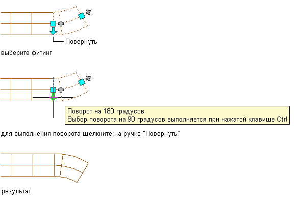 | повернуть фитинг на 90 градусов, | нажав и удерживая клавишу CTRL, щелкните ручку поворота ( |