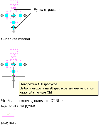 ) ручки отражения позволяют поворачивать встроенные элементы, фитинги и врезки на 180 или 90 градусов в направлении, указанном ручкой.