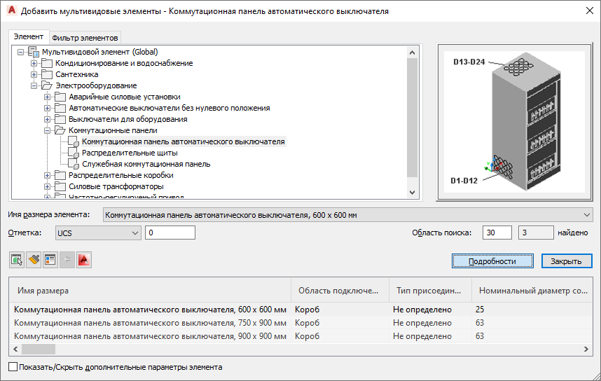 Добавление электрооборудования выполняется с помощью инструментов, имеющихся в палитре инструментов "Оборудование" в группе палитр инструментов электрической системы. В процессе работы выбирают инструмент и в диалоговом окне "Добавить многовидовые элементы" выбирают элемент и конфигурируют его свойства, а затем добавляют этот элемент в чертеж.