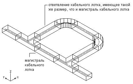 После того как участки кабельного лотка или короба нарисованы, в чертеж можно добавить ответвления для соединения участков и образования сети. Точно определить местоположение точек соединения на объектах чертежа можно с помощью привязок инструментарий AutoCAD MEP 2027.