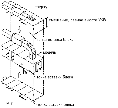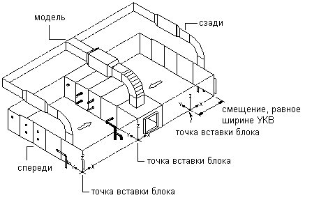 На представленных выше рисунках точка вставки вида модели показана в правом углу нижнего ребра передней стороны. Точка вставки видов сверху и снизу находится в правом углу переднего ребра, причем точка вставки вида сверху смещена на высоту установки кондиционирования воздуха. Точка вставки видов спереди и сзади находится в правом углу нижнего ребра, причем точка вставки вида сзади смещена на ширину установки кондиционирования воздуха. Точка вставки видов слева и справа находится в нижнем углу спереди, причем точка вставки вида слева смещена на длину установки кондиционирования воздуха.