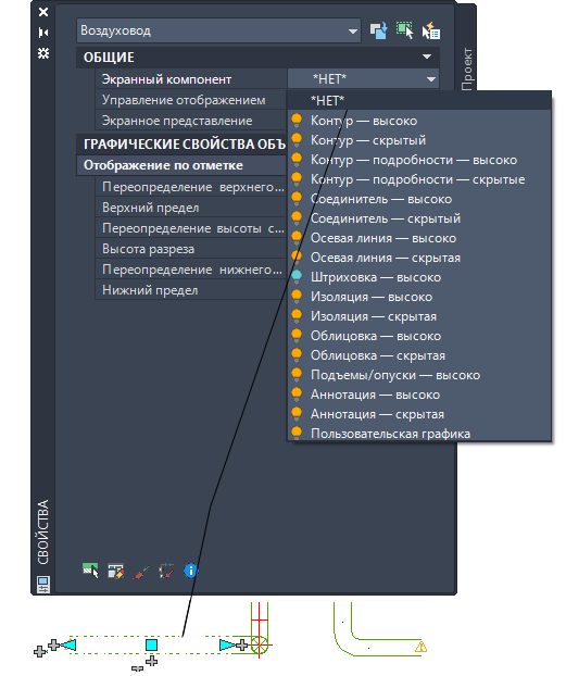 Объект "воздуховод", расположенный ниже диапазона отображения
