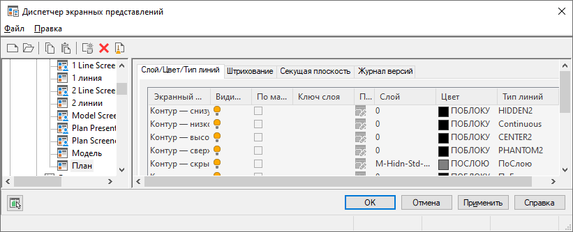 Компоненты отображения на основе отметок можно настроить с помощью Диспетчера стилей или Диспетчера экранных представлений. В следующем примере показано, как выглядят экранные компоненты "Контуры" в Диспетчере экранных представлений, когда функция отображения по отметке включена: