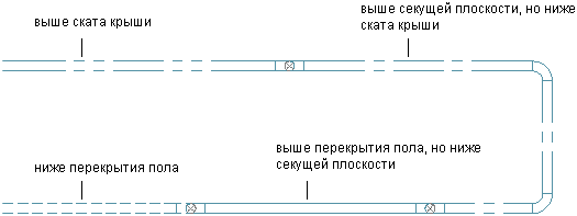 В некоторых регионах объекты инженерной системы здания должны отображаться в технической документации по-разному в зависимости от отметки. Например, может потребоваться отобразить на виде в плане объект, расположенный под перекрытием пола, одним типом линии, а объект, расположенный над перекрытием, но ниже секущей плоскости, — другим типом линии.