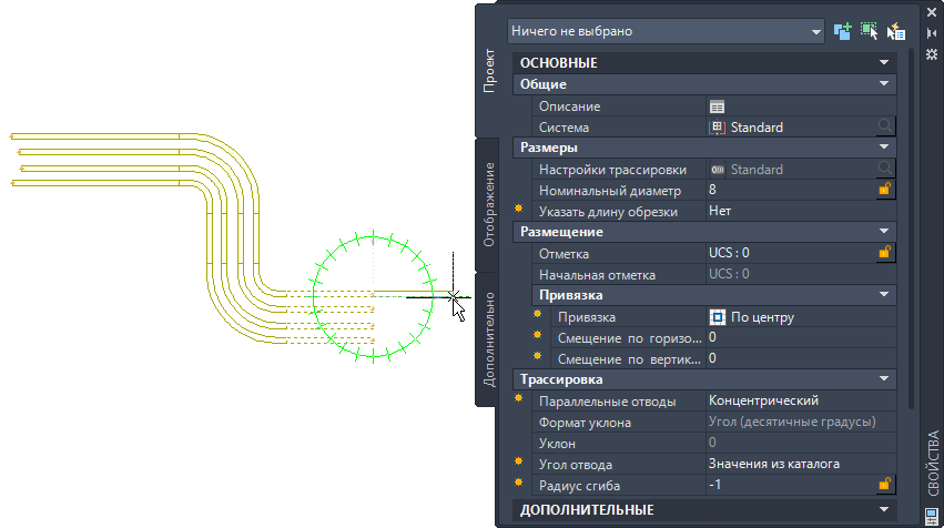 На палитре свойств доступно два параметра для настройки параллельных отводов: концентрический и постоянный радиусы. С помощью этих параметров можно указать тип радиуса отвода для параллельного участка короба.
