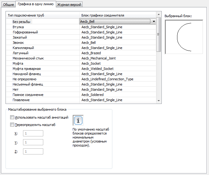 Прим.: При именовании блоков для уникальных типов присоединения используется блок графики Aecb_ConnectionType. Но для многих типов присоединения используется один и тот же блок графики Aecb_StandardPipe1LineGraphic.