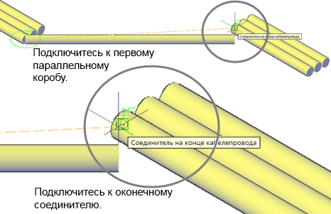 При соединении двух параллельных участков короба или трубы будут отображаться различные доступные варианты соединения.