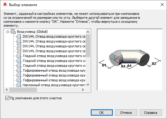 Диалоговое окно "Выбор элемента" с элементами воздуховода, упорядоченными по типу формы