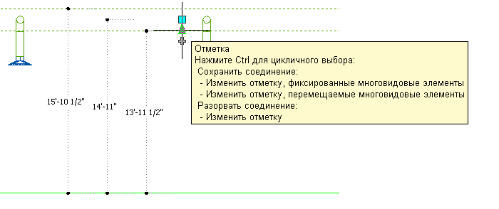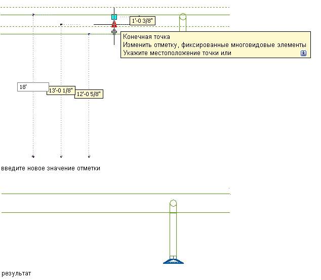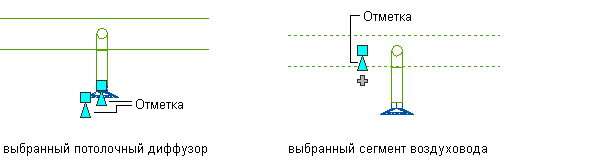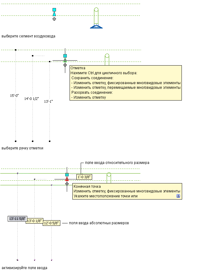 ) можно изменять отметки мультивидовых элементов ОВК и сегментов воздуховода при их присоединении к существующим участкам воздуховодов в боковой и изометрической проекциях. Ручки отметки на мультивидовых элементах ОВК отображаются в точках вставки и присоединения. Ручки отметки на сегменте воздуховода дают возможность изменять отметку относительно верхней части, осевой линии или нижней части сегмента.