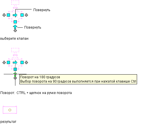 Ручка поворота позволяет повернуть элемент на 180 градусов. Ручка отражения ориентирует элемент (встроенные или прикрепленные якорем многовидовые элементы, фитинги или врезки) по направлению потока.