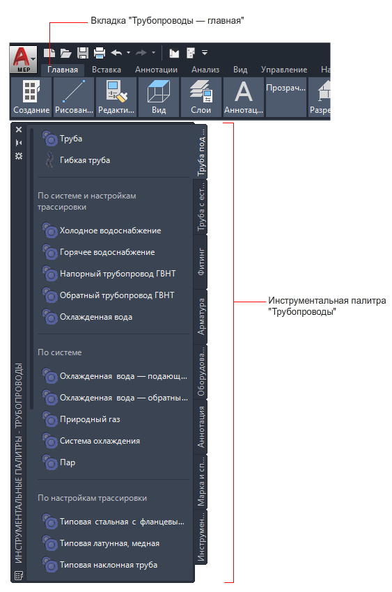 При работе в организации широкого профиля и выполнении нескольких различных задач проектирования, таких как разработка системы ОВК и трубопроводной системы, использование рабочих пространств особенно удобно. Их можно использовать для сохранения конфигураций пользовательского интерфейса, подготовленного для выполнения разных задач. После создания рабочих пространств при необходимости можно быстро переключаться между ними.