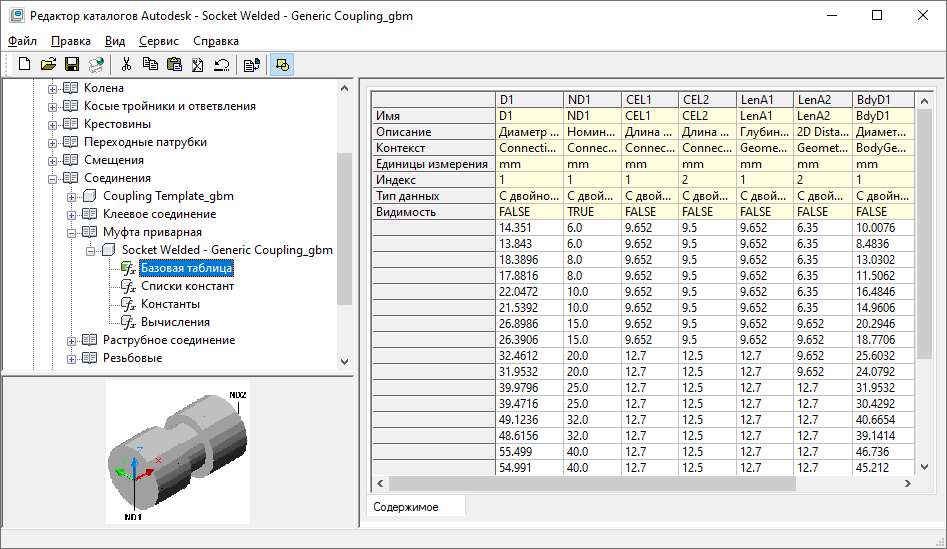 Каждый каталог трубопровода в профиле "Глобальный" содержит фитинги, общие для этого типа трубопровода. Фитинги труб классифицируются, как правило, по типу элемента, типу присоединения и номинальному давлению. Следующий пример демонстрирует структуру каталога для соединений с приварной муфтой класса 3000.