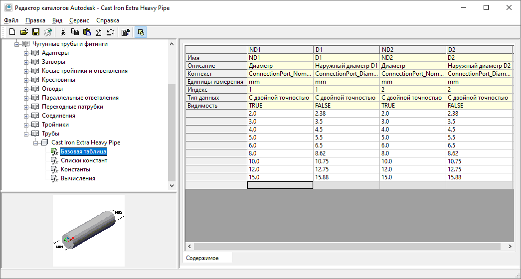 Каталог элементов труб содержит элементы тысяч размеров. Область трубопроводов содержит следующие типы элементов: