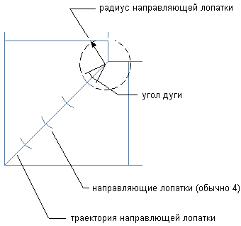 | Угол дуги | Определяет размер дуги направляющих лопаток относительно круговой траектории, определяющей направляющие лопатки; например, угол 45 градусов составляет 1/8 круговой траектории. |