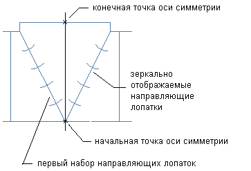 | Выполнить зеркальное отражение текущих направляющих лопаток | Зеркальное отражение первого набора направляющих лопаток относительно заданной оси (для тройников) ![]() |