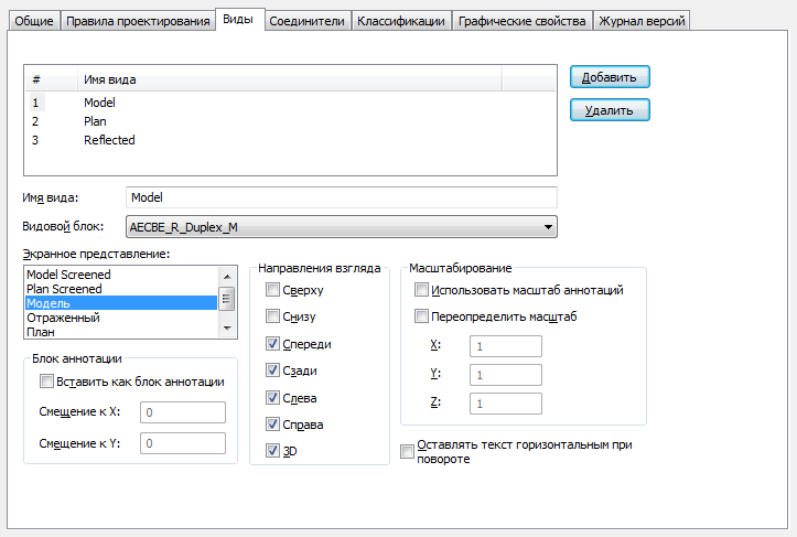 Свойства вида, предусмотренные в сценарии преобразования обозначений, отображаются на вкладке "Виды" диалогового окна "Диспетчер стилей". На этой вкладке свойство "Пояснительный вид" называется "Блок аннотации".