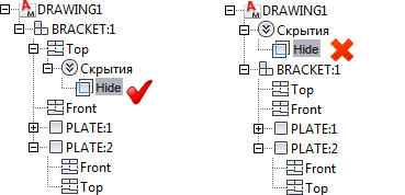 На чертежах с включенной структурой Mechanical имеет значение положение скрытия в структуре.