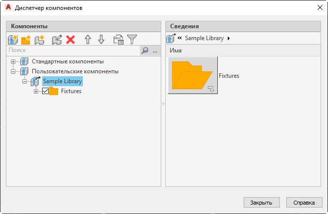 Библиотека компонентов — это не один файл, а набор файлов, хранящихся в одной папке. Создать библиотеку компонентов или скопировать уже имеющуюся на другом компьютере библиотеку можно с помощью команды AMCONTENTMANAGER.