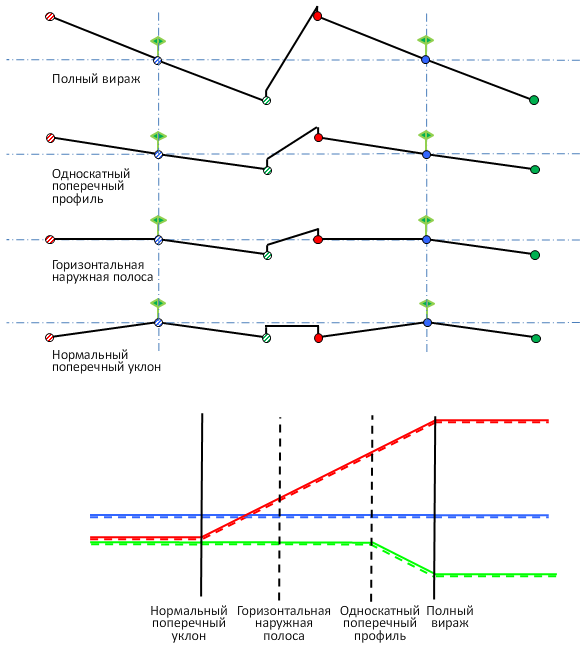 На иллюстрации ниже приведено описание метода вращения в центрах для двускатной дороги с разделительной полосой.