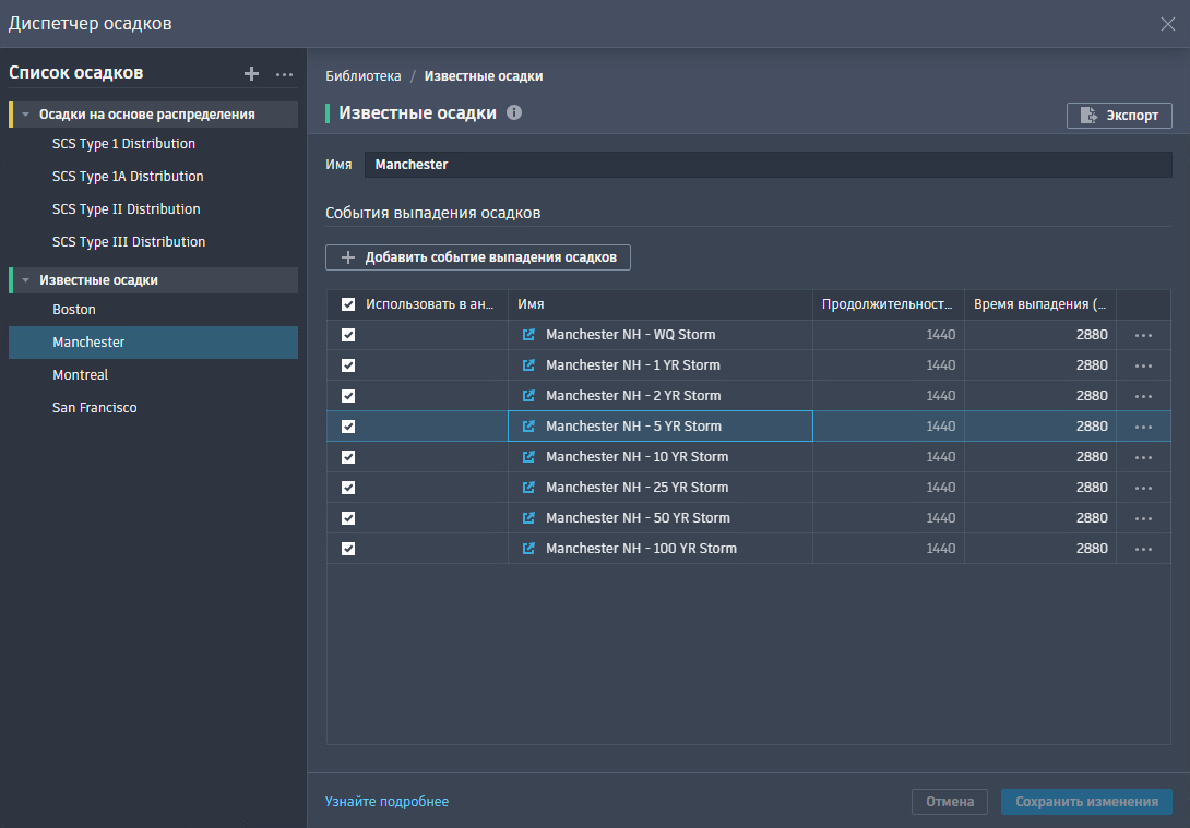 Диспетчер осадков упрощает работу с данными осадков, поддерживая создание новых моделей осадков и изменение существующих, а также удаление неиспользуемых данных, что обеспечивает полный контроль над всеми входными данными осадков.