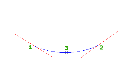 На иллюстрации показана свободная круговая кривая между объектами 1 и 2 с точкой прохождения 3.