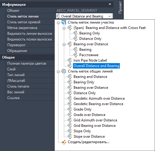 Обратите внимание в следующем примере на то обстоятельство, что кроме стилей меток линии участка имеется также и стиль меток общих линий, предназначенный для использования при редактировании метки линии участка.