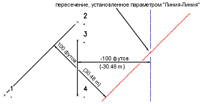 Определяется пересечение между линией, проведенной через точки 1 и 2 со смещением 100 футов вправо и линией, проведенной через точки 3 и 4 со смещением 100 футов влево.