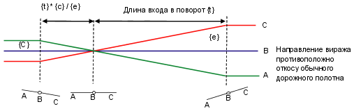 Раздел "Opposing" (Встречный) определяет общее расстояние перехода как равное длине продолжения отгона {t}. Расстояние до начала кривой равно {p}*{t}, а расстояние между пикетами с нормальным поперечным уклоном и горизонтальной внешней полосой равно {t} * {c} / {e}.
